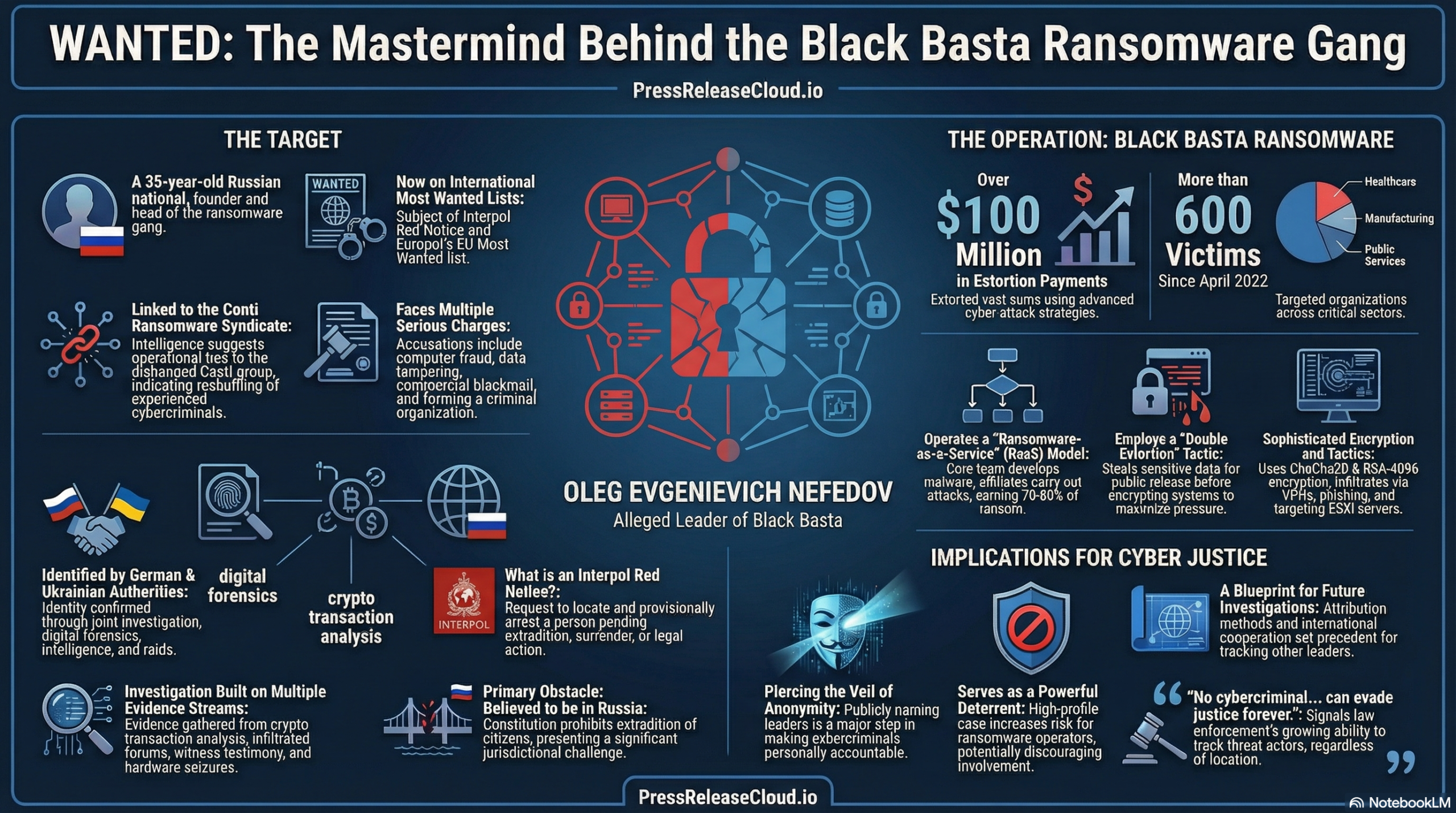 • Oleg Evgenievich Nefedov, a 35-year-old Russian national, has been identified by German and Ukrainian authorities as the head of the Black Basta ransomware gang